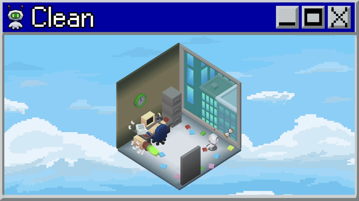 Your own cleaning robot. Whilst completing your day-to-day tasks, your robot friend helps you clean your little desktop room.